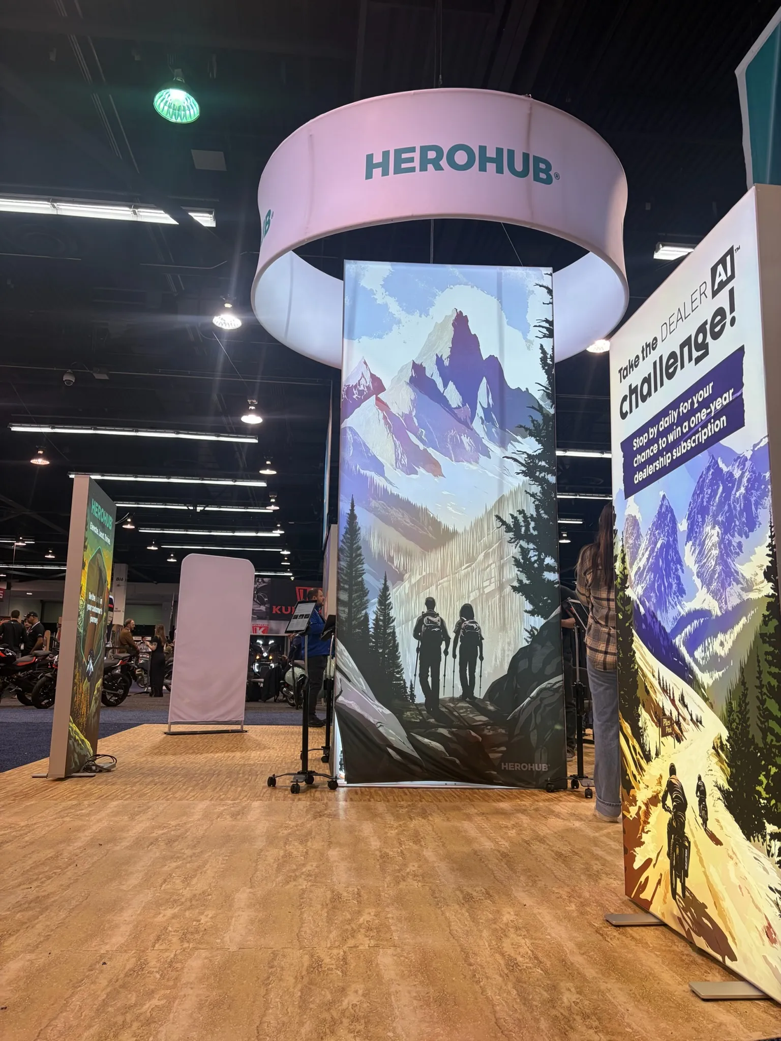 Herohub exhibited with our natural world–themed booth, featuring wood tones, earth colors, and imagery inspired by mountains, lakes, rivers, and forests. Our team wore flannel shirts with vintage motorcycle-style patches.